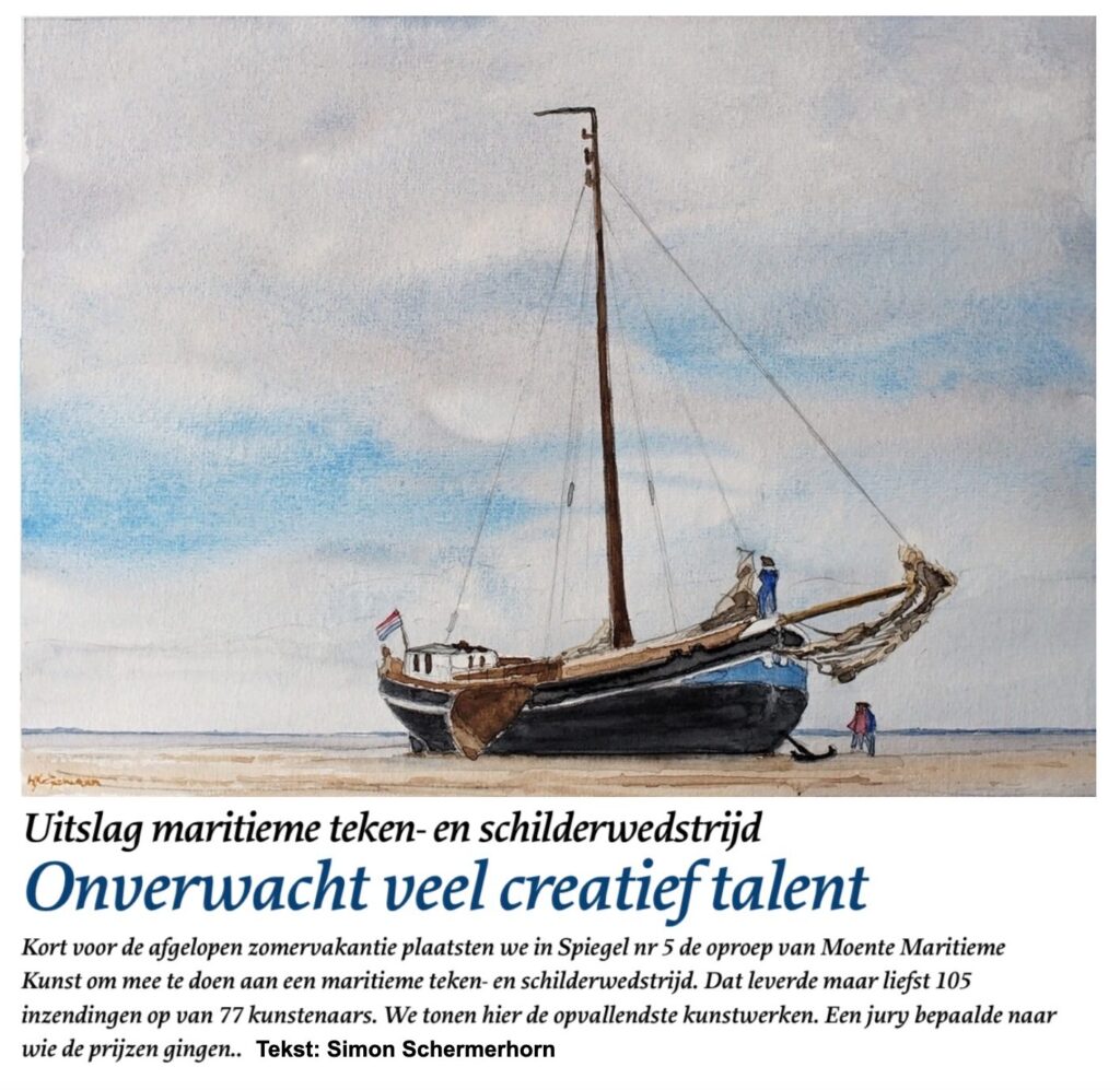 Begin januari 2026 verschijnt In het tijdschrift ‘Spiegel der Zeilvaart’ een artikel over de ‘Maritieme Teken- en Schilderwedstrijd. Vier pagina’s met 14 kunstwerken met als titel ‘Onverwacht veel creatief talent’. Een voorproefje: De kop van het artikel met de aquarel van de klipper Najade van 1e Prijs-winnaar Hielke Leijenaar: